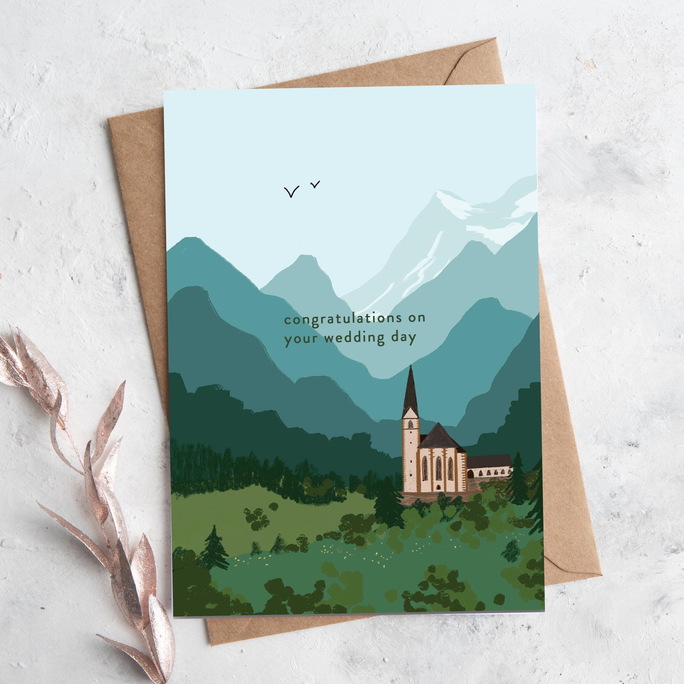A brand new wedding card printed from an original illustration, on thick uncoated card stock