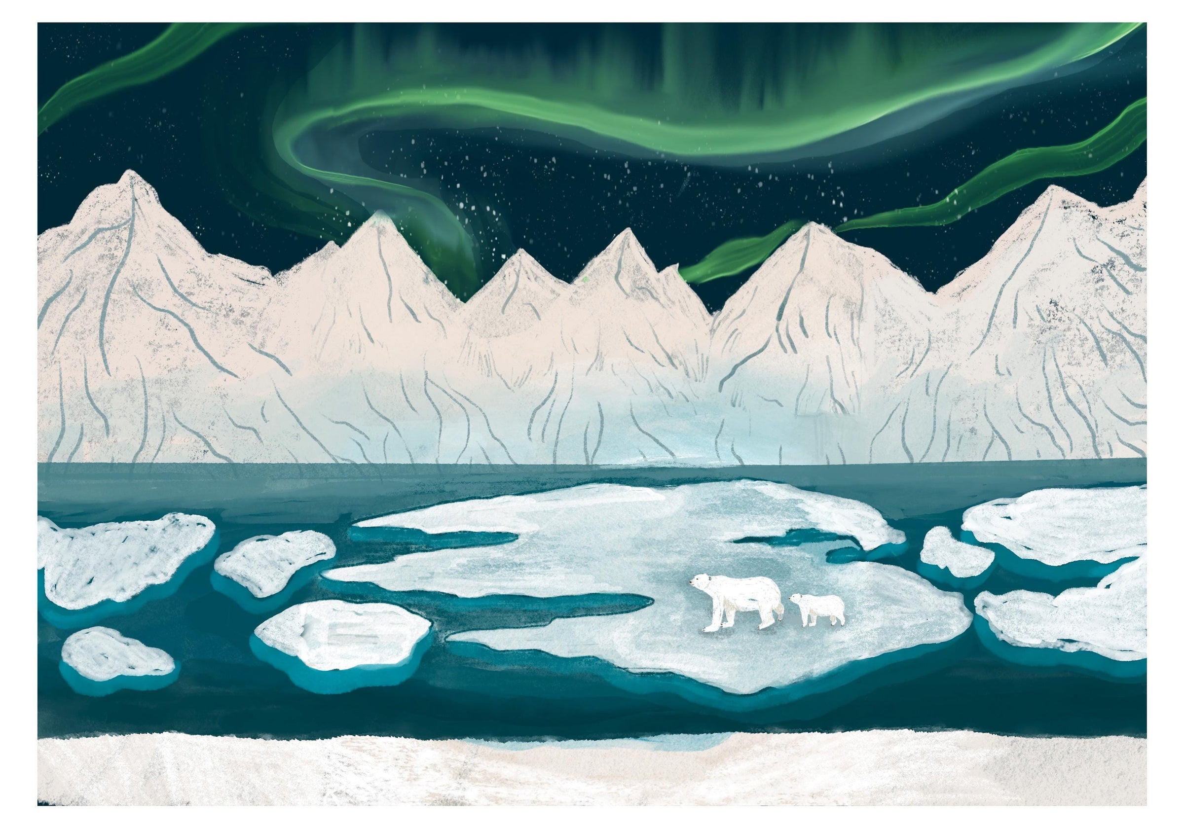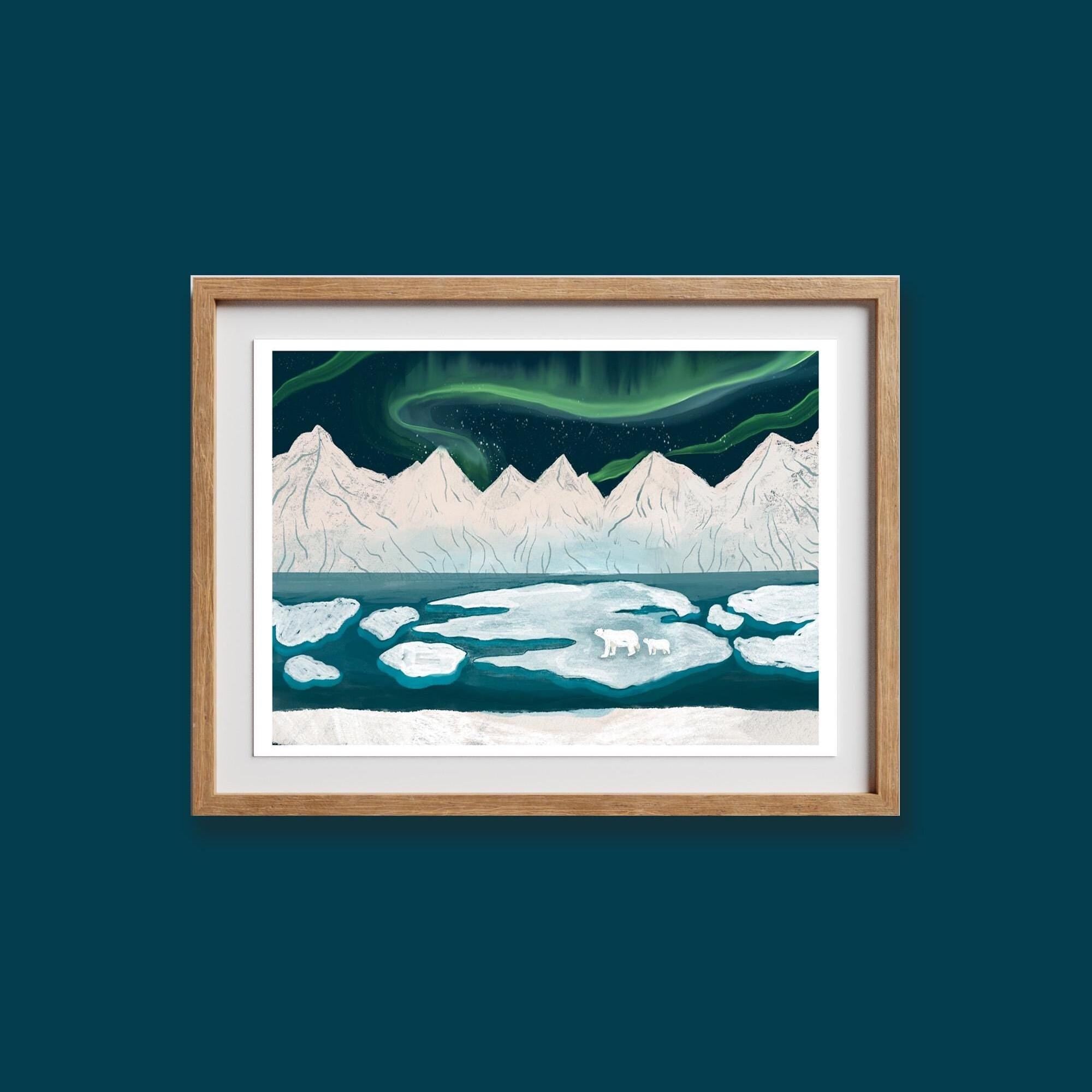 Giclee art print of my new landscape painting, of two polars under the northern lights.